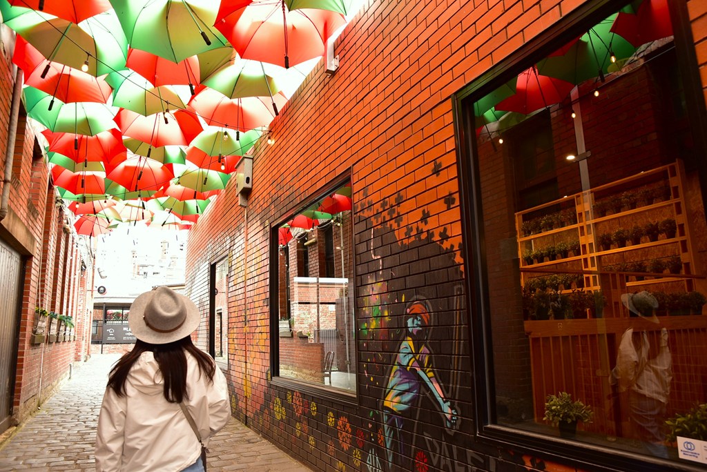 そんな歴史的な街並みが通り沿いに立ち並ぶ一方で、細い路地に足を踏み入れると現代的なストリートアートが突如として現れるのがバララットの面白さ。Armstrong Street(アームストロング通り)の中程にある細い路地にはカラフルな傘がびっしりと吊るされており、ひっそりとしたフォトスポットになっています。